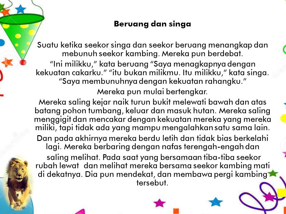 Untuk tambahan cerita kali ini akan diberikan sebuah cerita dengan judul “A Bear and A Lion”. Ada apa kira-kira dengan kedua hewan tersebut, apakah mereka bersahabat?